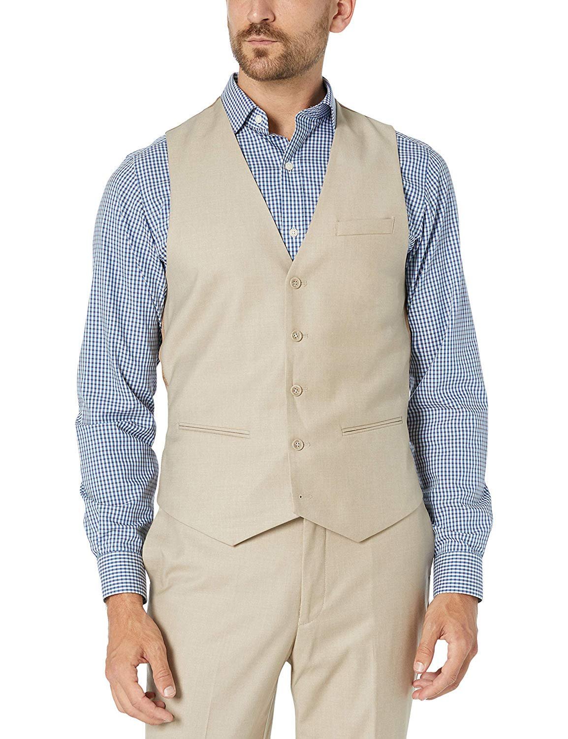 Adam Baker Men's Slim Fit 3-Piece (Jacket, Vets, Trousers) Vested Suit Set - Beige & Light Grey